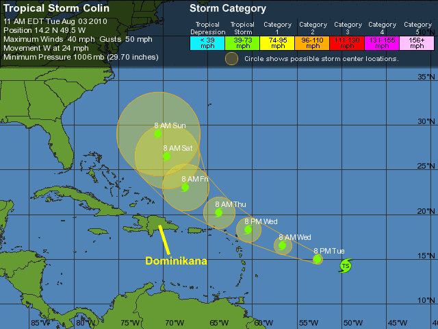 Narodowe Centrum Huraganowe ostrzega przed Tropikalnym Sztormem, którego nazwano COLIN. Znajduje się ok. 945 mil (ok 1520 km) na wschód od Małych Antyli.