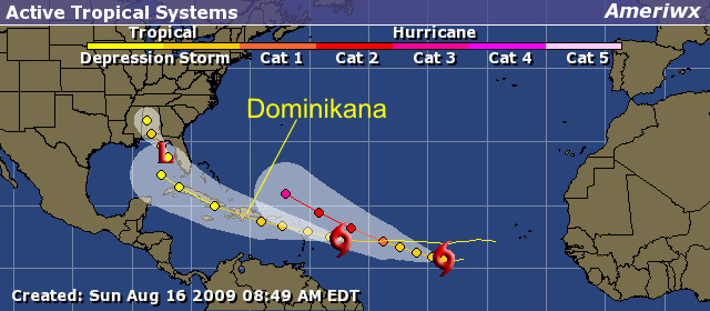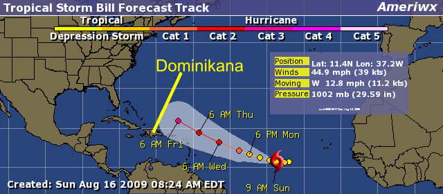 Jak pokazuje mapka rokowania nie są najlepsze ... być może Bill nie uderzy w Dominikanę centralnie, ale będąc na jej wysokości prawdopodobnie osiągnie już 4 kategorię i jego skutki wyspa odczuje napewno ... prognozy wykazują, że będzie on dużo silniejszy niż jego poprzedniczka.